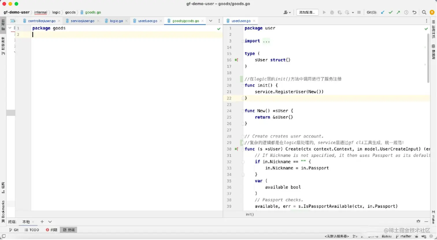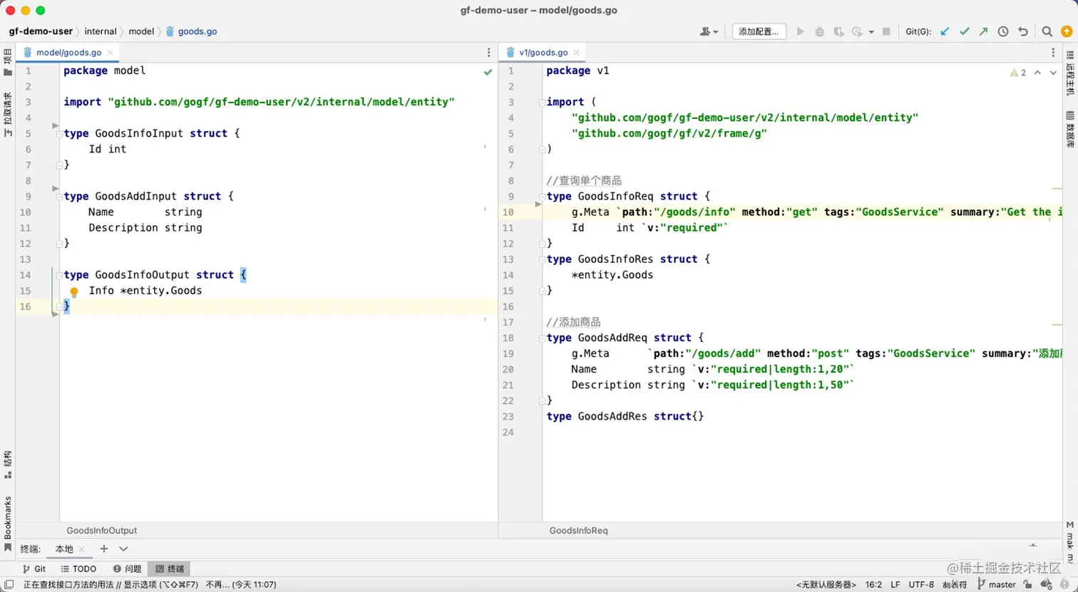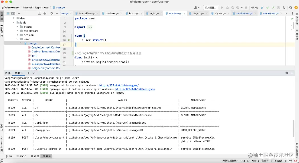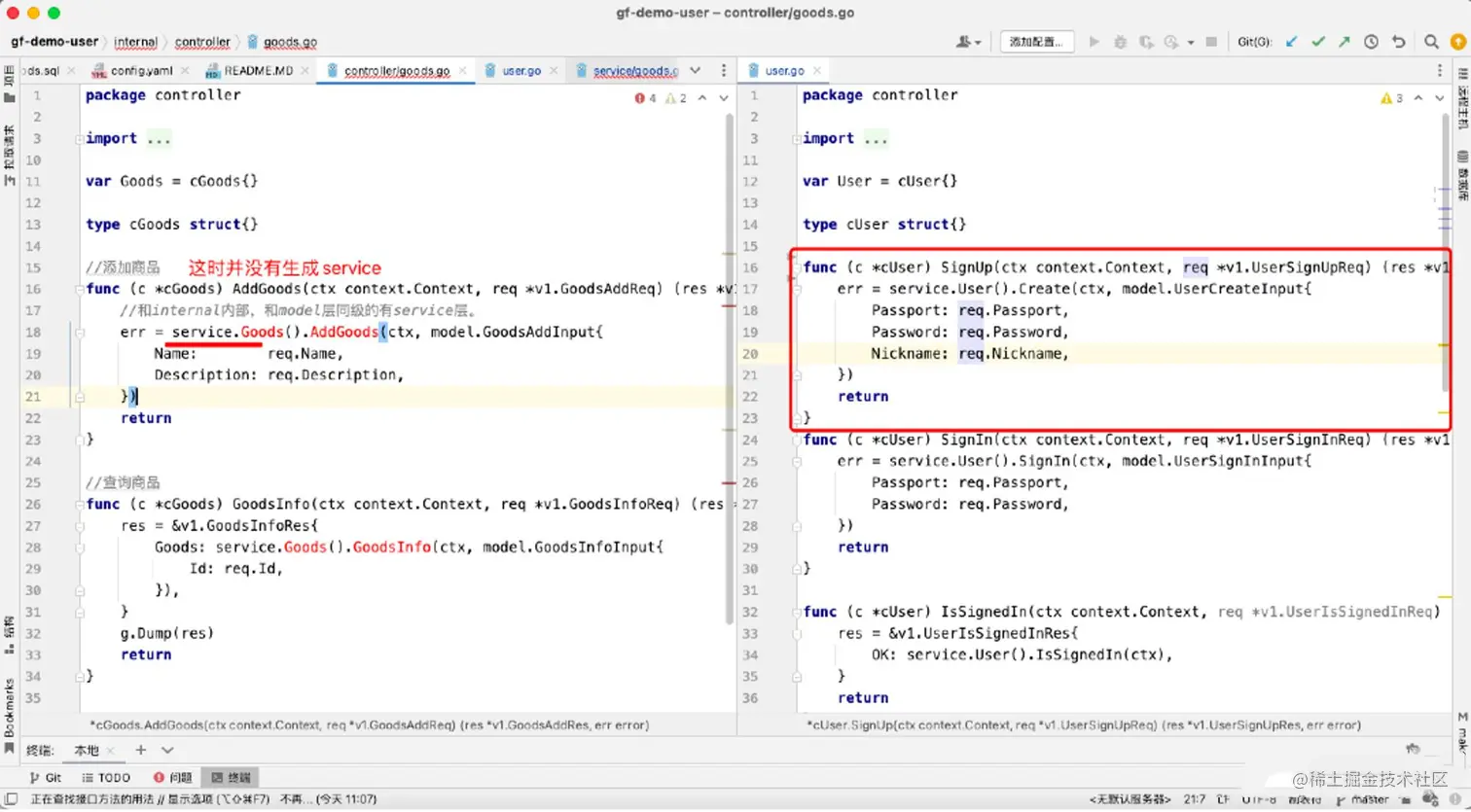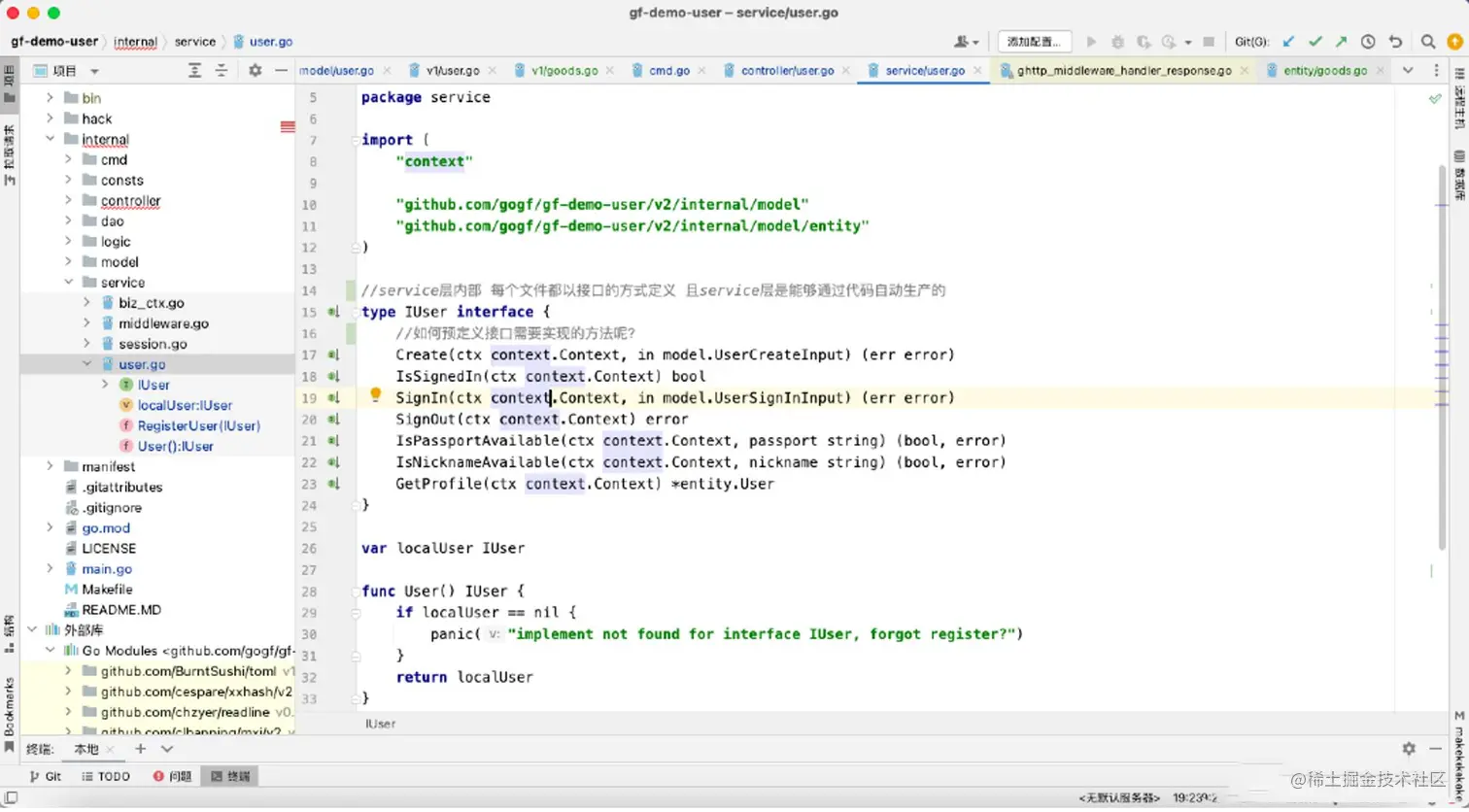 我们先点击示例项目中的user.go,查看一下service中都定义了什么: