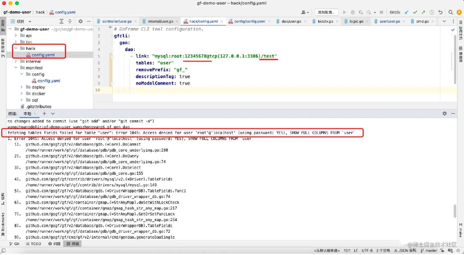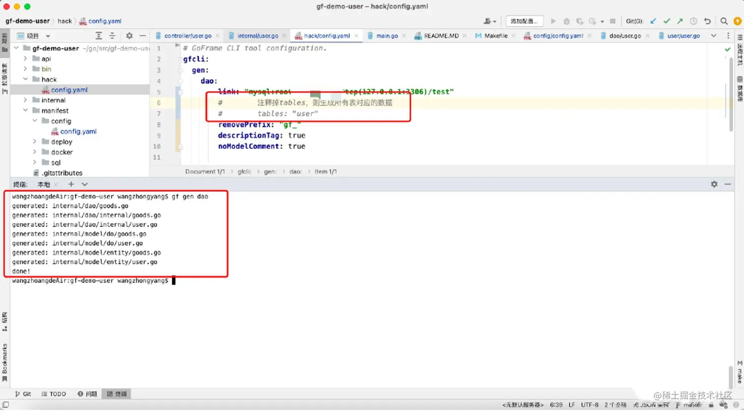 gf gen dao生成对应的dao/do/model目录代码 -