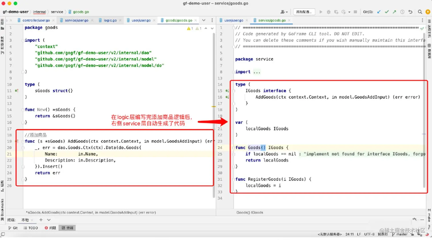 我们发现:在logic层编写完添加商品逻辑后,在右侧的service层自动生成了代码。