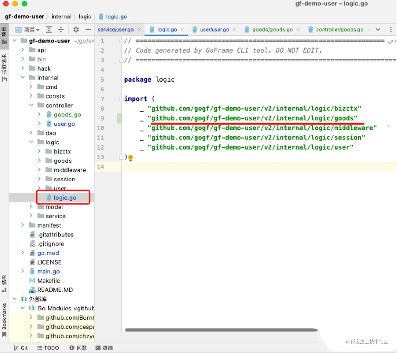 然后去查看logic.go文件是否添加了相关的依赖,没有的话也可以手动添加一下;