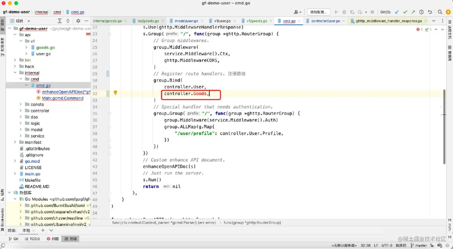 注册路由,对外暴露接口,比如这个项目是编写cmd.go文件。