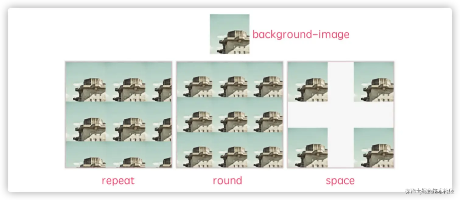 我们都知道,使用 repeat 的时候,有可能会造成背景图片在平铺的时候被裁剪。如果希望背景图片在平铺时不被剪切,那么可以使用 round 来替代,它的最大特色就是背景图片在平铺的时候会根据容器的宽高对背景图片做相应的尺寸调整。而 space 会留出相应的空间,即在保证背景图片不被裁剪的情况之下,对多出来的空间以空白的方式在背景图片之间留出。