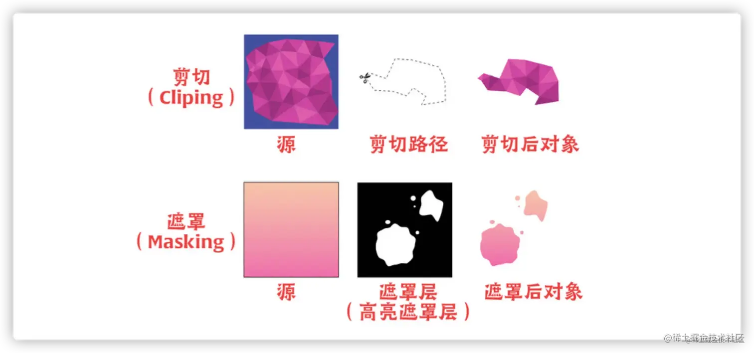 如果你对设计或设计软件较为熟悉的话,对于蒙层和剪切不会感到陌生。设计师在做一些设计稿的时候,时常也会用到蒙层和剪切的能力。随着 CSS 的发展,在 CSS 的世界中也有了这两个特性,它们在 W3C 的 《CSS Masking Module Level 1》规范中定义,主要的作用如下图所示: