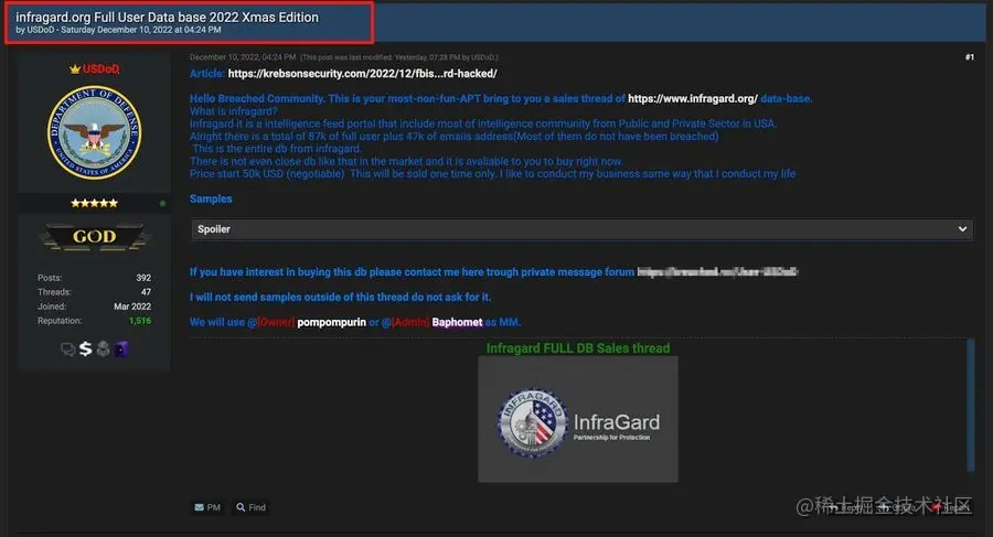 卖家是一个网名为USDoD的论坛成员,他要价5万美元出售包含姓名和联系信息的完整用户数据库。
