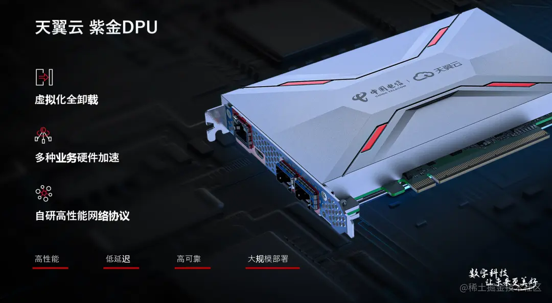 邵广禄表示,为了解决当前面临的问题,天翼云自主研发了基于紫金DPU的新一代云计算体系架构,实现对计算、网络、存储等算力资源的快速云化加速,具备高性能、低延迟、高可靠、可大规模部署的特点。
