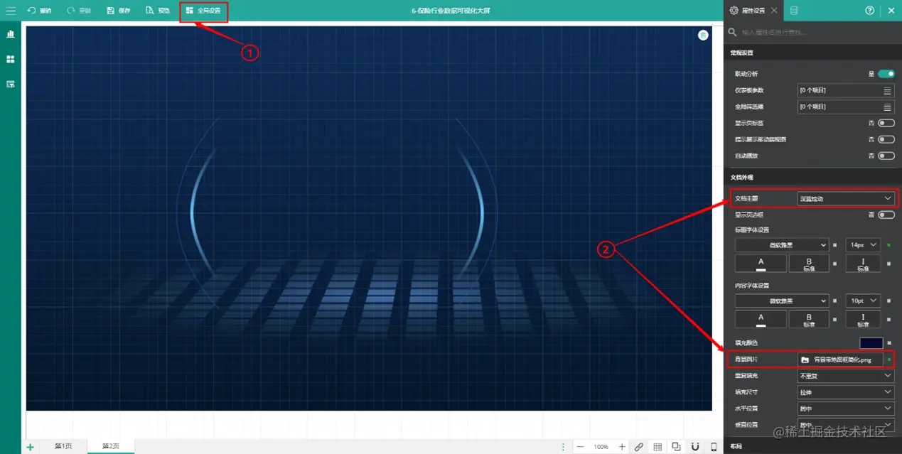 (1) 背景主题 全局设置背景主题,背景图片,以及添加背景动画效果。 点击全局设置,可以设置主题风格,也可以设置个性化的背景图片,如下图所示: