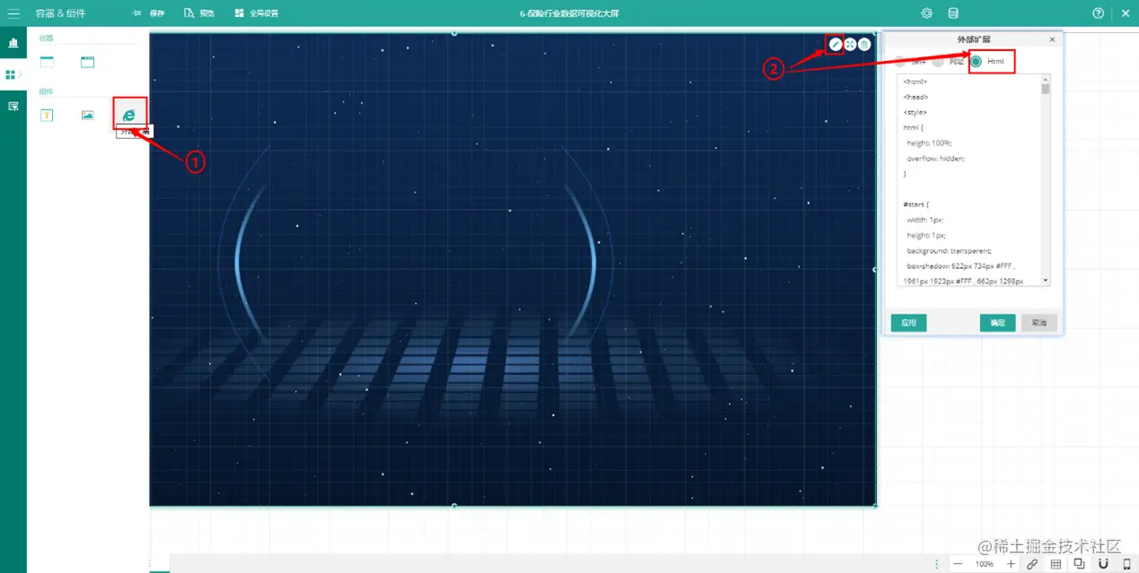 添加扩展插件实现动态背景,拖动扩展插件到设计器,然后进行编辑,利用html+css来实现背景的动画效果。