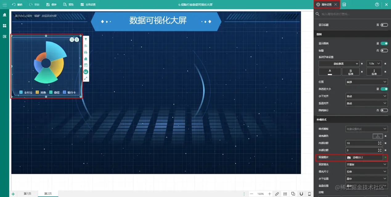 (3) 可视化组件背景或多种组件组合使用 可视化组件可以设置属性背景图片增加背景装饰,背景动画,也可以灵活组合多种组件,实现更灵活,更丰富的背景装饰。 给可视化组件设置背景图片属性增加背景装饰。