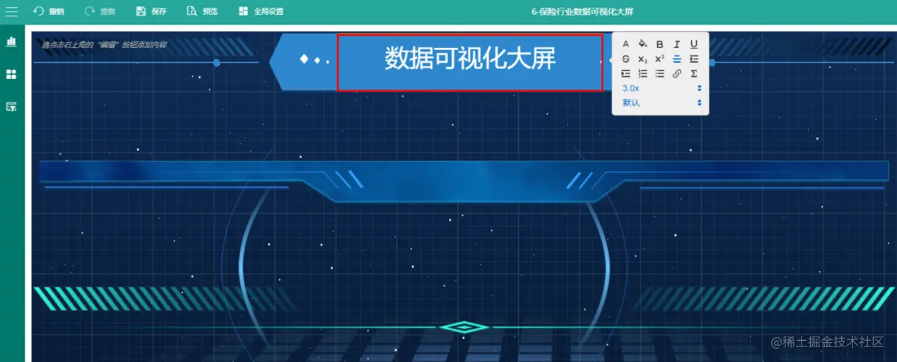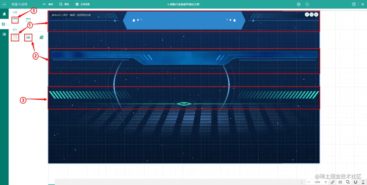 (2) 标题设置 灵活利用文本框,图片,容器,扩展插件等元素设置个性化酷炫的大屏标题。 可以选择图片,文本框或者容器作为底部装饰,选择该组件的背景图片进行替换,作为标题的背景装饰,文字边框等等。