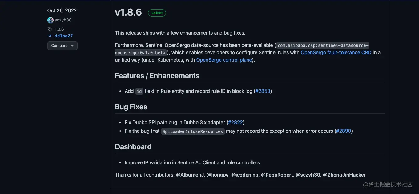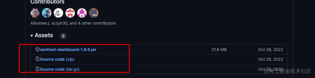 - 使用浏览器,您可以从Sentinel Dashboard下载页面在release发行版中选择下载对应版本的Sentinel控制台的 jar 包,如下图所示。