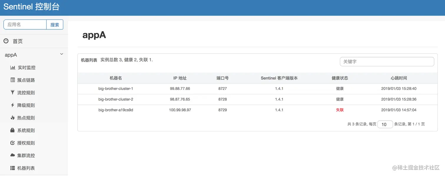 - 查看机器列表以及健康情况:Sentnel 控制台能够收集 Sentinel 客户端发送的心跳包,判断机器是否在线。