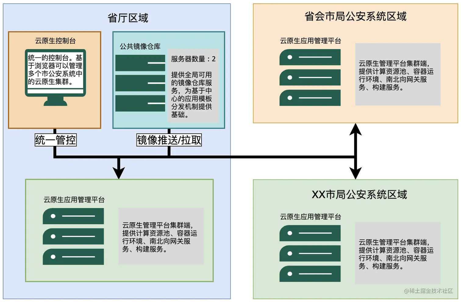 Rainbond 原生支持面向 Kubernetes 的多云管理能力。政府交付场景虽说与公网隔离,然而其实同个系统内往往具有想通的内部网络。借助 Rainbond 的多云管理能力,我们将省内多个城市政府部门的交付场景统一管理了起来,在省会建立了统一的管理控制台。这样的部署模式为业务系统快速在多个数据中心的交付提供了机制,极大的降低了业务系统在全省范围内交付的成本。