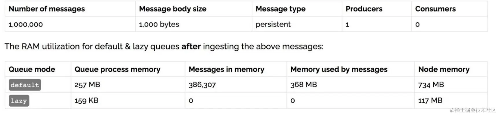在发送 1 百万条消息,每条消息大概占 1KB 的情况下,普通队列占用内存是 1.2GB,而惰性队列仅仅