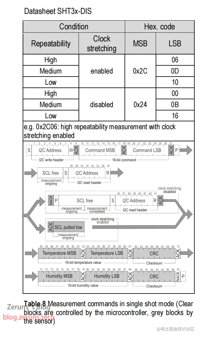 可知,不同的命令,获取的数据方式不一样,有单次测量和周期测量模式,还有一个Clock Stretching Enable 和 Disable的区别。