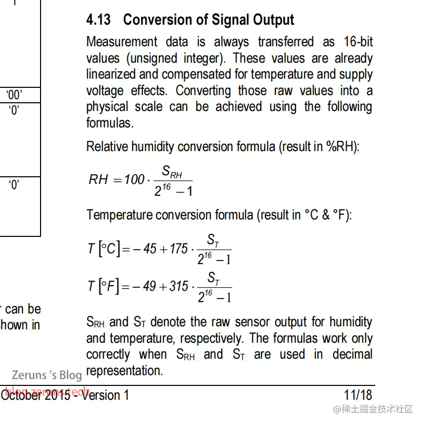 例如:采集到的湿度数值是0x6501,换算成十进制是25857。 则:湿度 = 100 * 25857 / (65536 - 1) = 39.45 (单位:%) 采集到的温度数值是0x6600,换算成十进制是26112。 则:温度 = -45 + 175 * 26112 / (65536 - 1) = 24.72 (单位:℃)