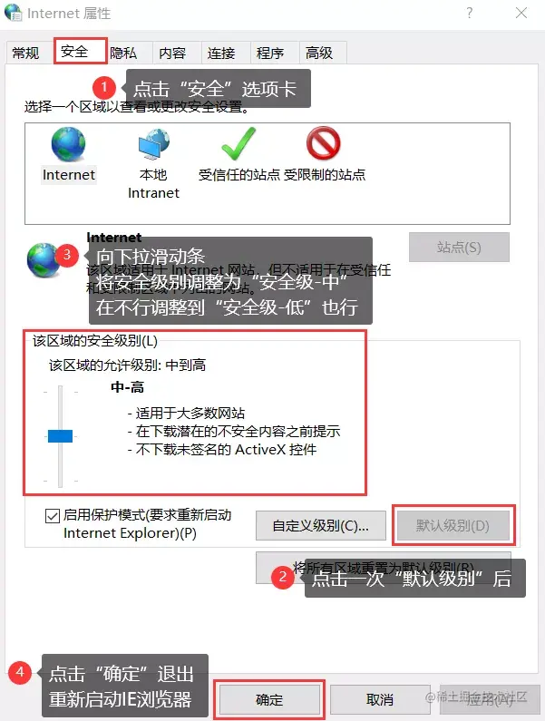 步骤2: 在弹出的窗口,切换到【安全】界面,点击【默认级别】。下拉滑动条,调到【安全级-中】,如果不行就调到【安全级-低】,点击【确定】后重启浏览器。