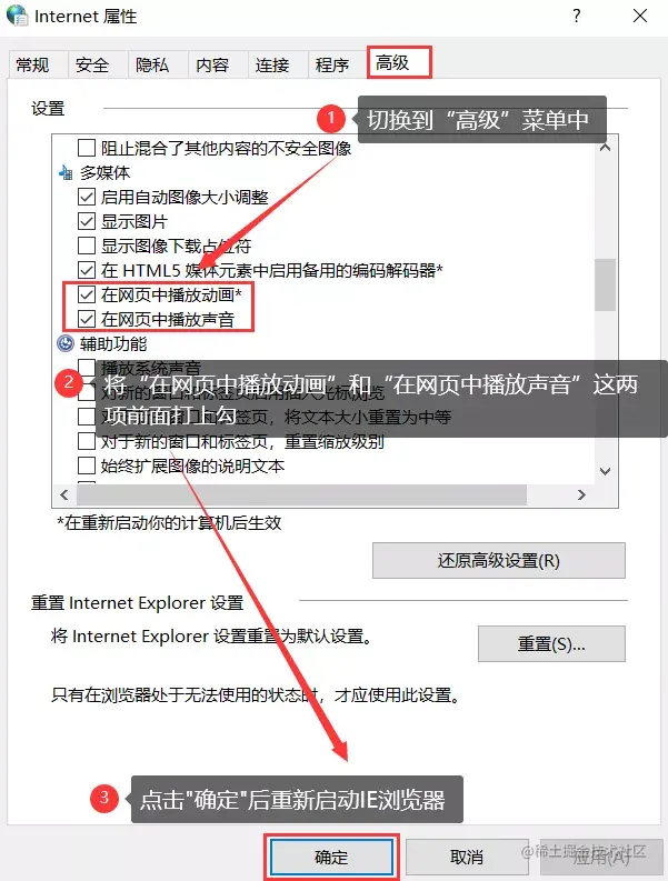 步骤2: 单击【高级】,下拉列表后找到并选择【在网页中播放动画】、【在网页上播放声音】。单击【确定】,并重新启动IE浏览器。