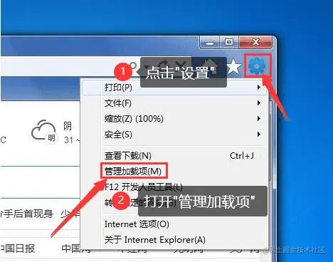 步骤2: 或者打开浏览器并启用Flash插件的启动项(一般系统是默认启动的,但不排除在操作过程中意外关闭的可能)。以IE浏览器为例,单击【设置】打开管理加载项;