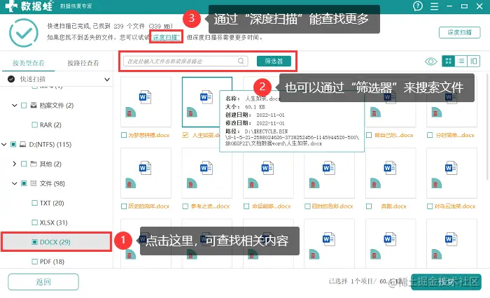 备注:恢复界面有【筛选器】可以直接搜索文件。