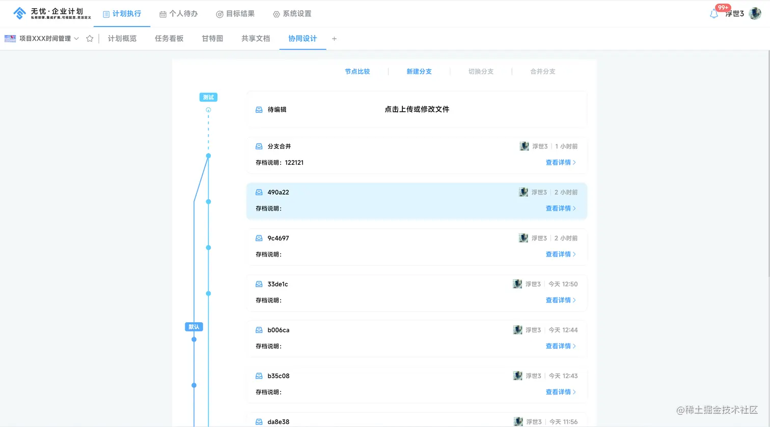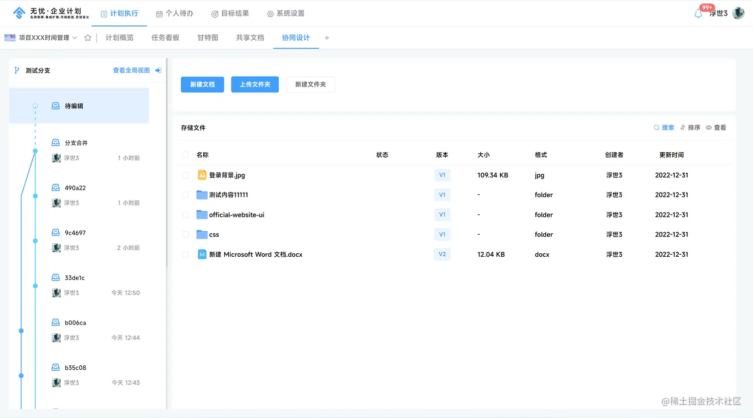 项目、计划执行过程中,JVS的企业计划中提供了两种不同的文档管理的扩展工具,一种是网盘是共享管理,一种是严格的版本协同控制。