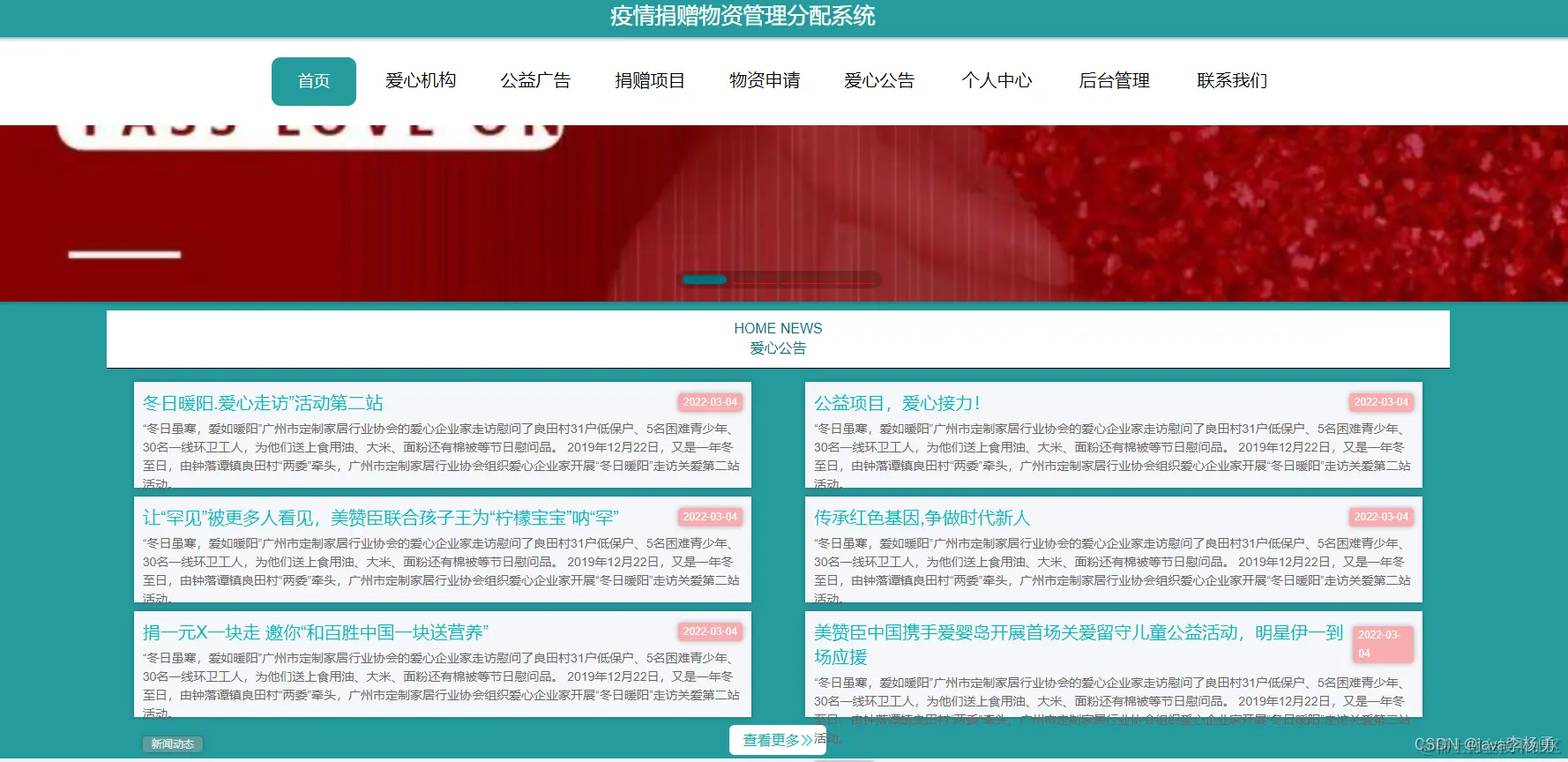 3、功能的完善性:可以管理首页、个人中心、用户管理、项目类别管理、广告分类管理、机构管理、广告信息管理、捐赠项目管理、物资信息管理,物资申请,审核,物资订单等,捐赠订单管理以及系统管理模块的修改和维护操作。