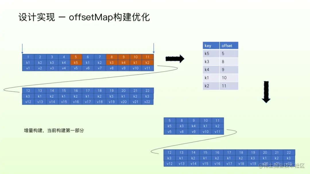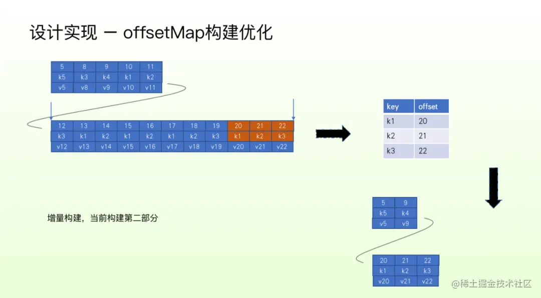 因此不能使用全量构建方式,不能将所有要 compact 的文件的 OffsetMap 一次性构建,需要将全量构建改为增量构建,构建逻辑也会有小的变化。