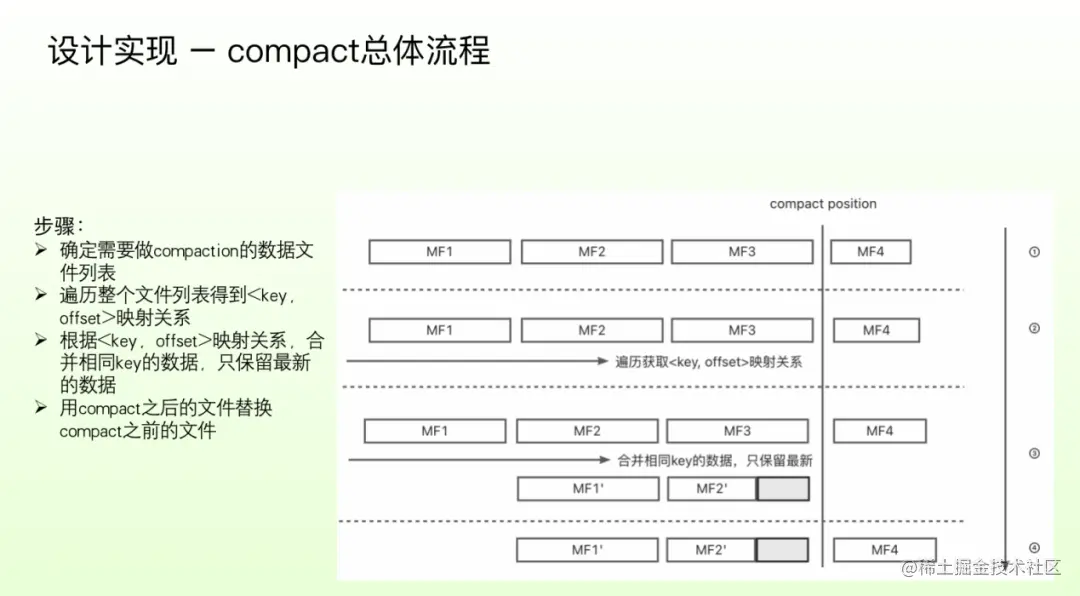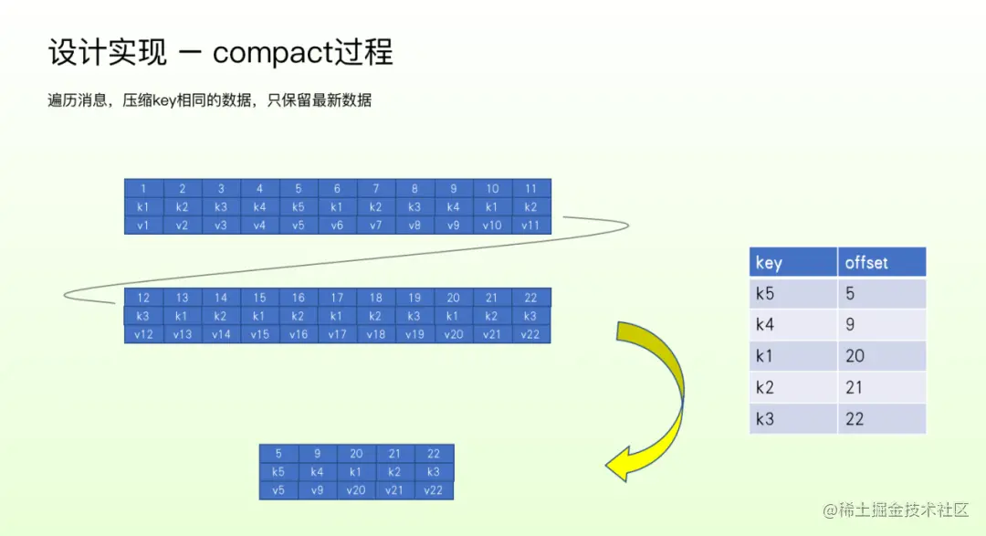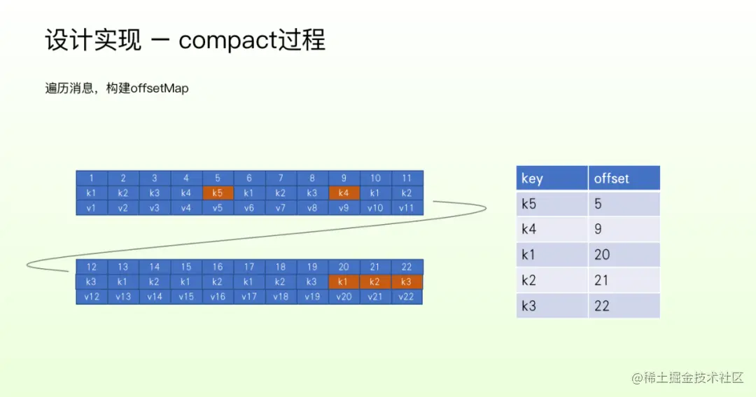 做 compaction 时会遍历所有消息,将相同 key 且 offset 小于 OffsetMap 的值删除。最终通过原始数据与 map 结构得到压缩之后的数据文件。