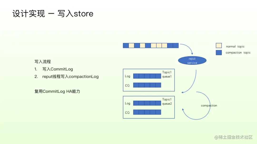 - compact 以分区为维度进行。如果多个分区同时做 compact ,效率较低。因为很多分区的 key 同时在一个结构里,会导致同一个分区能够 compact 的数据比较少, 并且 compact 之后也需要重新写一份么,因此,索性就在 compact 之前将消息通过 reput service 重新归整一遍。