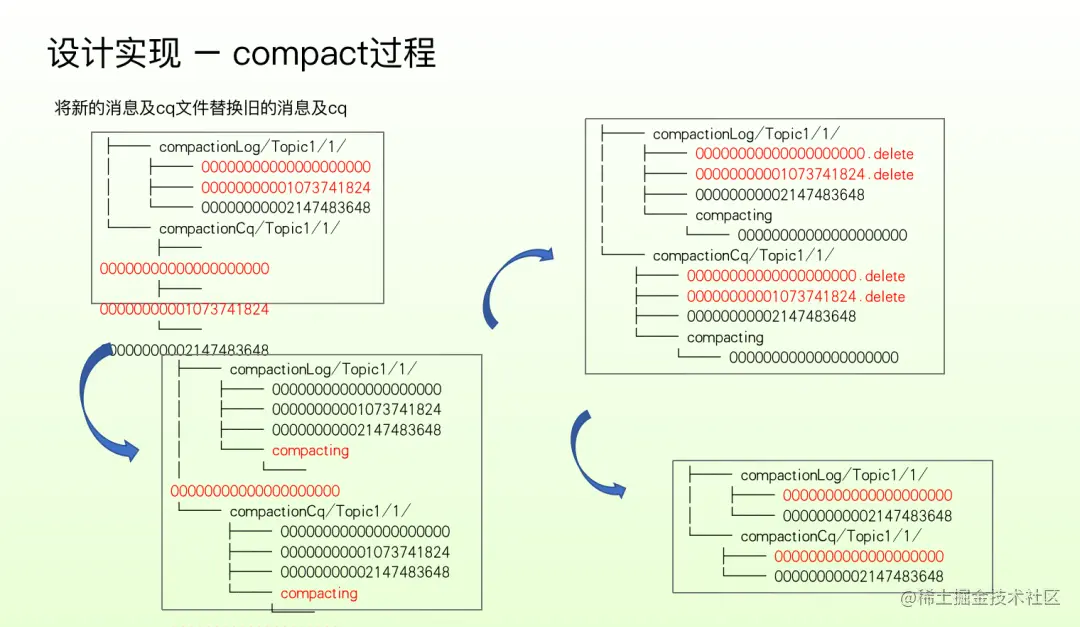 上图为目录结构展示。写入时上面为数据文件,下面为索引,要 compact 的是标红两个文件。压缩后的文件存储于子目录,需要将老文件先标记为删除,将子目录文件与 CQ 同时移到老的根目录。注意,文件与 CQ 文件名一一对应,可以一起删除。