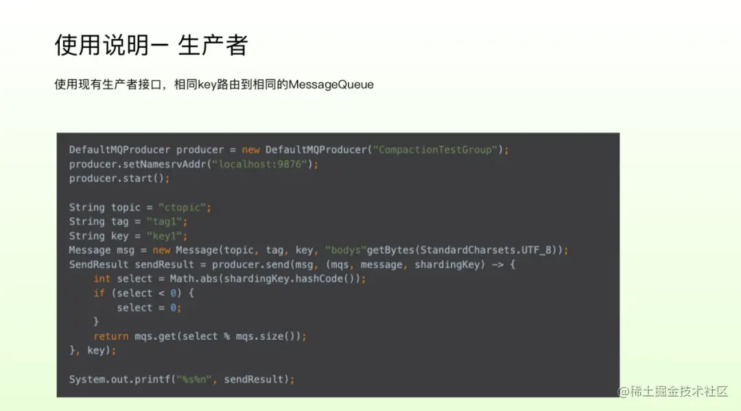 生产者侧使用现有生产者接口,因为要按分区做 compact ,因此需要将相同 key 路由到相同的 MessageQueue,需要自己实现相关算法。