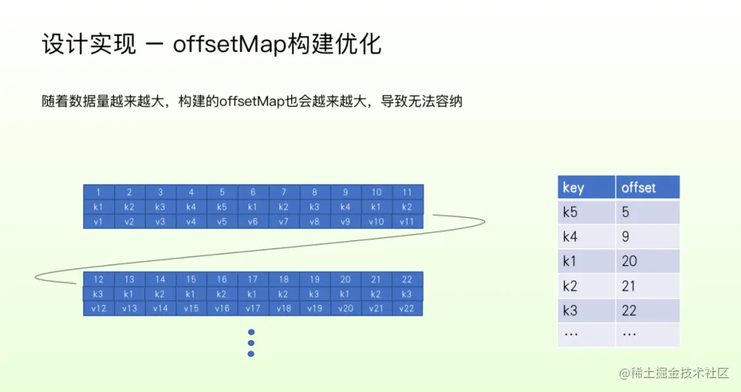 随着数据量越来越大,构建的 OffsetMap 也会越来越大,导致无法容纳。