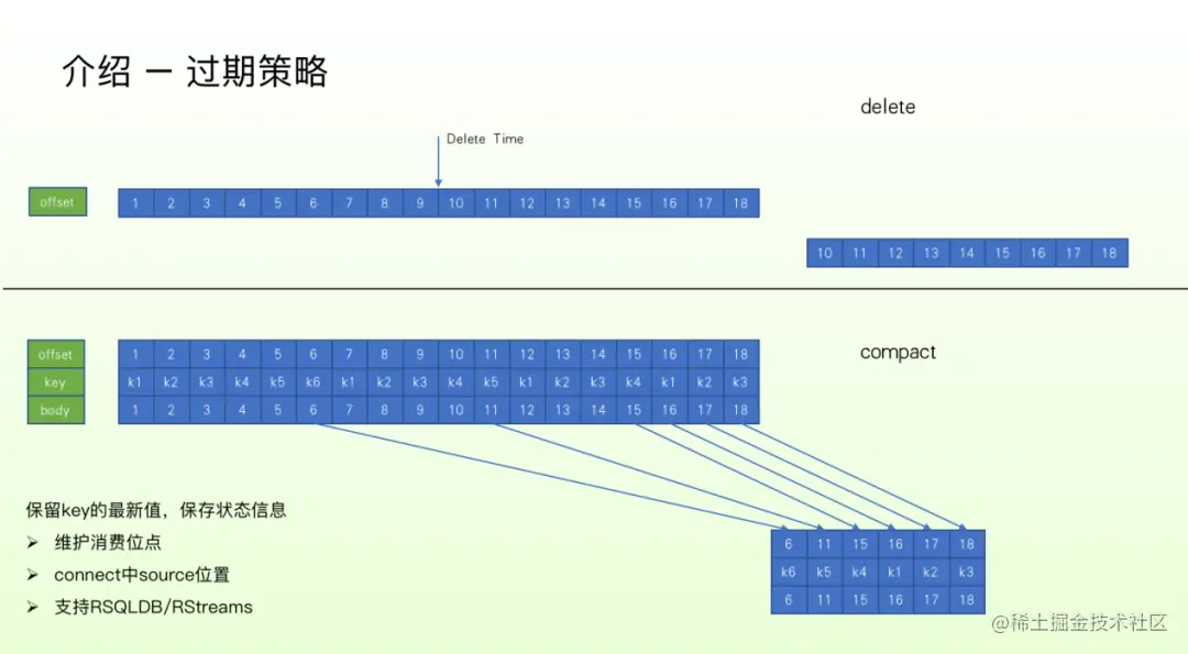 该特性的应用场景主要为维护状态信息,或者在需要用到 KV 结构时,可以通过 Compaction Topic 将 key-value 信息直接保存到 MQ,从而解除对外部数据库的依赖。比如维护消费位点,可以将消费组加分区作为 key ,将消费位点做 offset ,以消息形式发送到 MQ ,压缩之后,消费时获取最新 offset 信息即可。另外,像 connect 里的 source 信息比如 Binlog 解析位点或其他 source 处理的位点信息均可存到 Compaction Topic。同时 Compaction Topic 也支持 存储 RSQLDB 与 RStreams 的 checkpoint 信息。