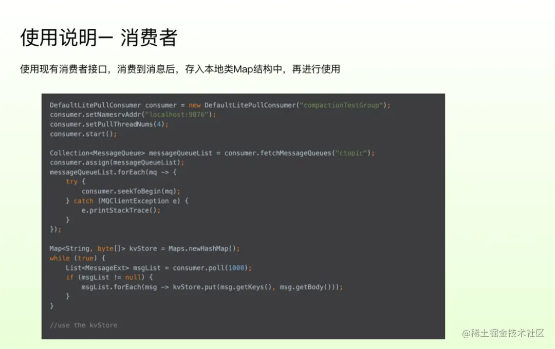 消费者侧使用现有消费者接口,消费到消息后,存入本地类 Map 结构中再进行使用。我们的场景大多为从头开始拉数据,因此需要在开始时将消费位点重置到0。拉取完以后,将消息 key 与 value 传入本地 kv 结构,使用时直接从该结构拿取即可。
