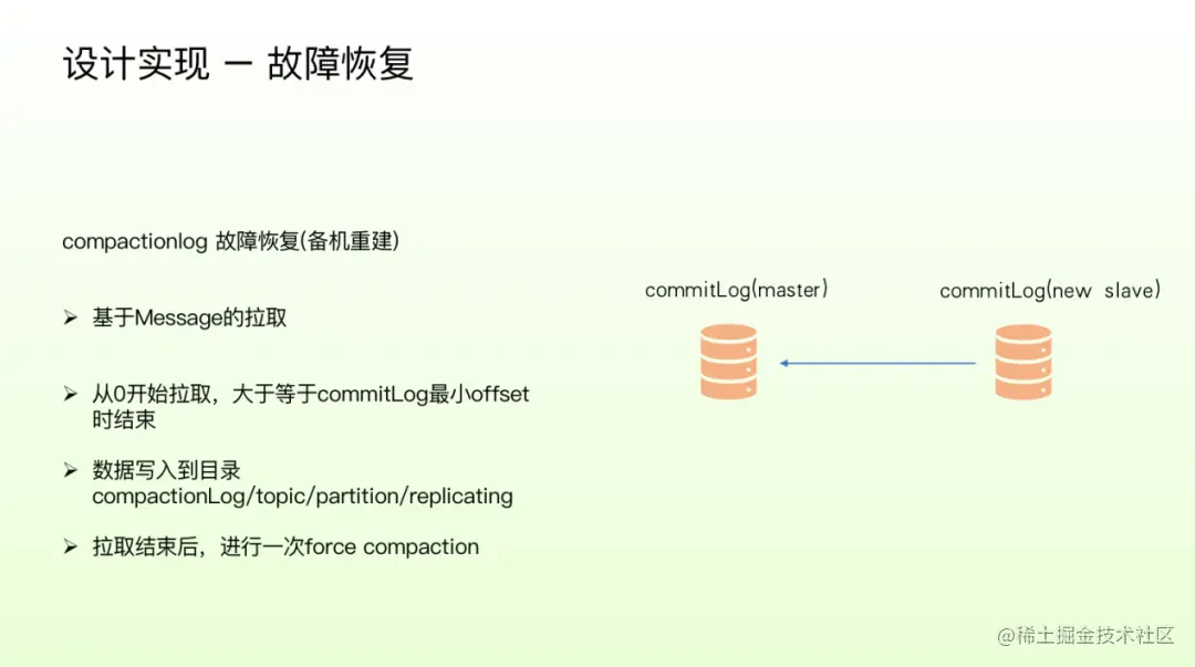 因此,我们实现了基于 message 的复制。即模拟消费请求从 master 上拉取消息。拉取位点一般从 0 开始,大于等于 commitLog 最小offset 时结束。拉取结束之后,再做一次 force compaction 将 CommitLog 数据与恢复时的数据做一次 compaction ,以保证保留的数据是被压缩之后的数据。后续流程不变。