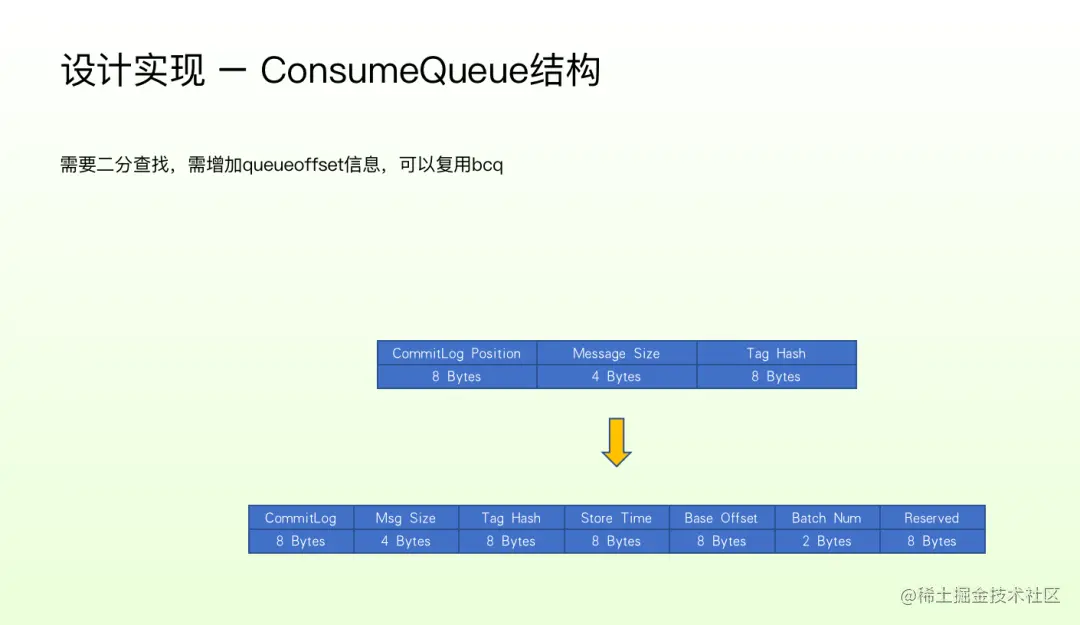 二分查找需要 queueoffset 信息,索引结构也会发生变化,而 bcq 带有 queueoffse 信息,因此可以复用 bcq 的结构。