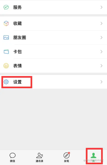 **步骤1:**打开手机微信,点击下方的【我】,接着点击【设置】。