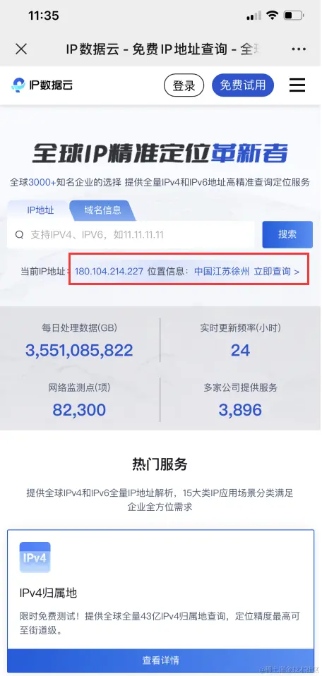 相对于IP地址的宏观使用,我们个人通常可以使用IP地址排除和修复一些常见的连接问题,那么我们要如何获取IP地址?其实有一个简单的方法,在Android手机上打开常用浏览器,打开网址www.ipdatacloud.com/?utm-source… ,在页面上就能找到你的IP地址,并且可以免费查询IP地址归属地。