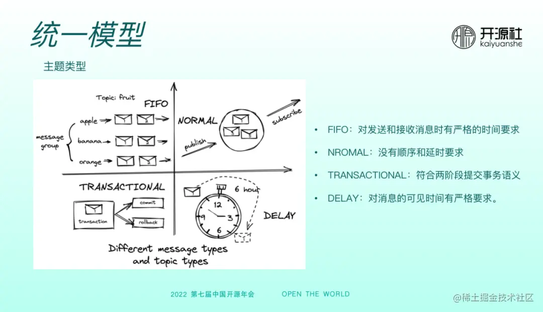 此前,客户端不做 topic 类型校验,任何一种类型消息都可以发往 topic 。但是在RocketMQ 5.0 之后会对 topic 类型做校验,真正从 topic 主题类型上做了区分,比如顺序消息 topic 只能发顺序消息。此前的 delay 消息为分级别延时消息,而现在为支持毫秒级精度的定时消息,可以支持任意时间精度。