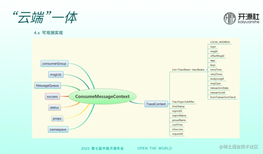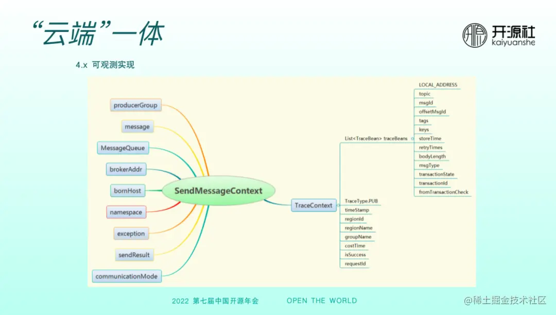 以往的可观测是基于消息轨迹实现,在发送消息和消费消息时,将上下文中的参数添加进轨迹消息,在后台攒批异步发送。上图为发送消息的所有 context,包括MessageQueue、MessageID 、IP 等信息。