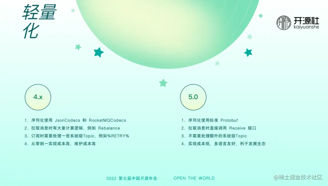 ③4.x版本的实现和维护成本非常高,因此5.0版本并没有基于4.x进行迭代和更新。设计之初有一种思路为直接在4.x客户端上增加 gRPC 协议,迭代升级成为5.0,但这相当于扛着历史包袱往前走,也违背了轻量化原则,因此被否定。