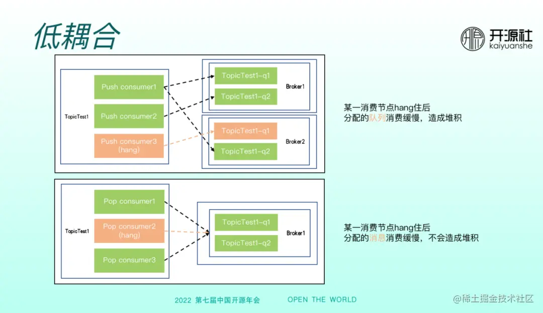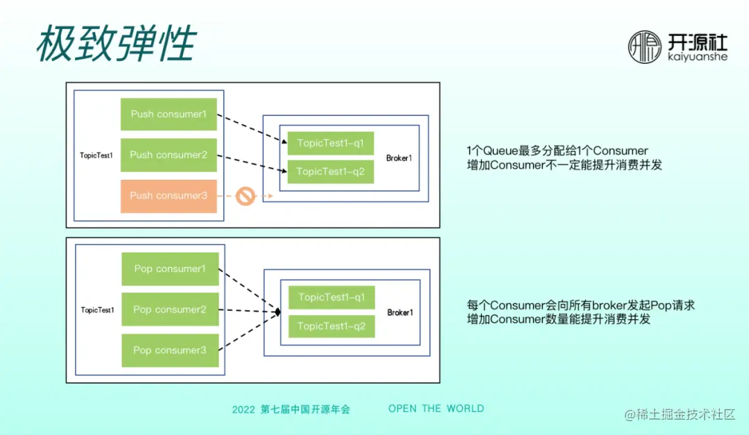 因此,从极致弹性和低耦合上可以看出 RocketMQ 5.0 之后使用 Pop 协议的优越性,只需要简单地在消费能力不足时扩容、富余时缩容,单一节点故障也不会影响到全局。