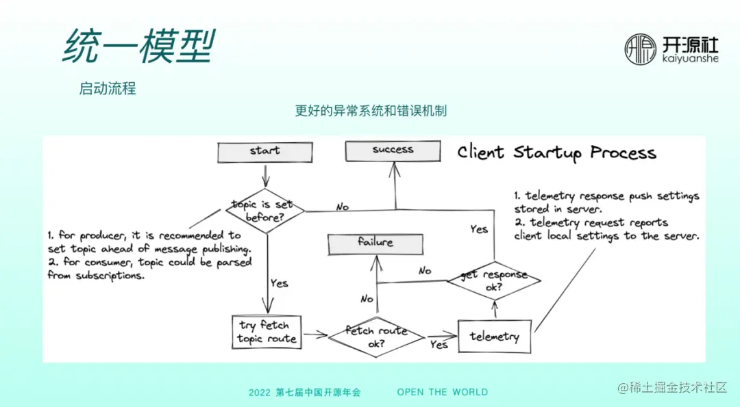增加了准备工作后,配置问题或本身网络问题可以提前被发现,比如 topic 路由信息不存在,启动时会先对 bonding topic 做检查,每一个发送者、生产者可以提前设置预留 topic 信息,再根据错误信息进行检查,判断是否可以启动。