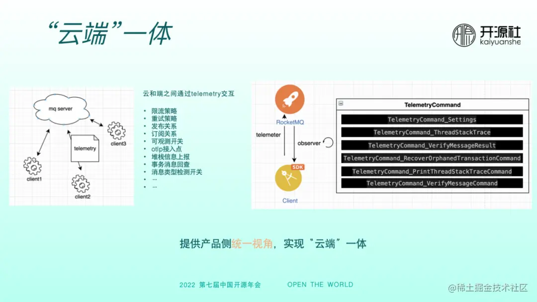 RocketMQ 5.0 采用 telemetry 遥测协议与服务端进行协同。遥测协议的作用为使云和端之间通过 telemetry 进行交互,包括但不限于限流策略、重试策略、发布和订阅关系管控、可观测开关、接入点信息、堆栈信息等。主要实现方式为直接由 SDK 向服务端发起 telemetry 请求,然后往 observer 读写上图所示的指令即可。