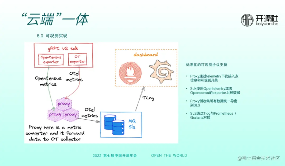 Telemetry 遥测协议是将可观测开关以及接入点下发到客户端,Proxy 会默认将接入点信息设置为自己,可以将客户端上报的所有可观测消息在服务端做收敛,再统一使用标准的 OpenTelemetry 和 Opencensu 两个协议上报到 SLS , SLS 再通过 TLog 的方式与 Prometheus、Grafana 进行对接。