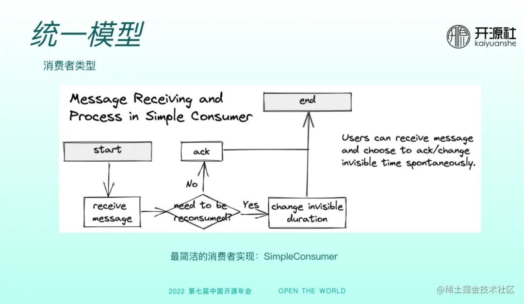 同时,模型定义了各种各样的消费者,有不同的消费者实现,比如 PushConsumer 、PullConsumer 以及 SimpleConsumer ,底层均使用 pop 协议实现。比如以前的PushConsumer 是基于手动拉的方式,而现在采用了 pop 方式。
