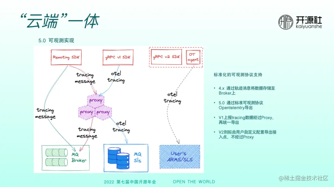Tracing 的数据链路比较复杂,也需要先经过 proxy 将可观测数据导到 proxy 上。而Tracing 的数据量较大,此前也曾考虑过直接通过用户自定义配置导出接入点,不经过 proxy ,但这会引发其他问题,比如4.x用户希望接入 RocketMQ 5.0 服务端使用可观测能力,则需要通过轨迹消息解码进行解析再通过标准化可观测协议输出。