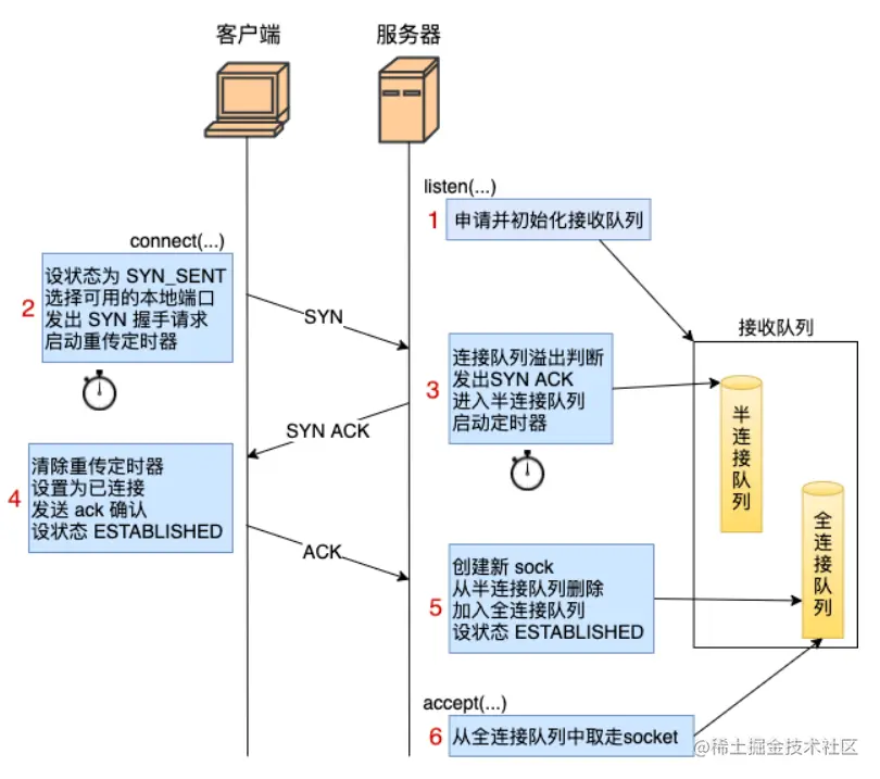 但我今天想给出一份不一样的答案。其实三次握手在内核的实现中,并不只是简单的状态的流转,还包括半连接队列、syncookie、全连接队列、重传计时器等关键操作。如果能深刻理解这些,你对线上把握和理解将更进一步。如果有面试官问起你三次握手,相信这份答案一定能帮你在面试官面前赢得非常多的加分。