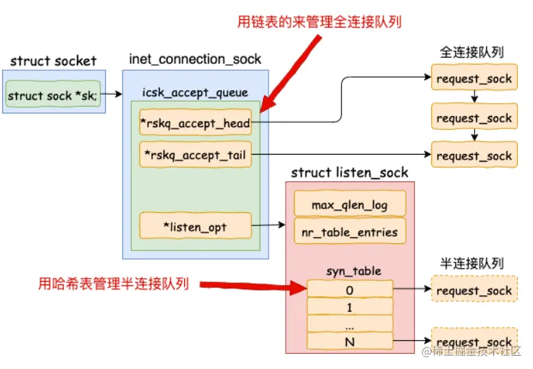 当全连接队列和半连接队列中有元素的时候,他们在内核中的结构图大致如下。