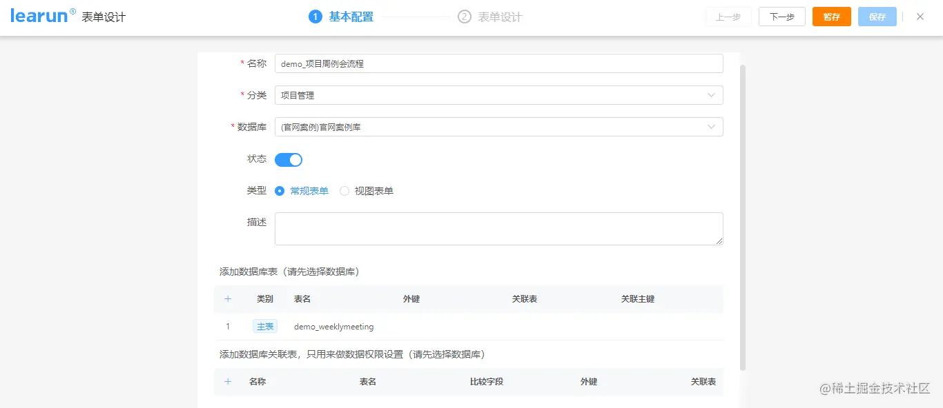 进入表单基本配置界面填入表单名称,选择对应的分类、数据库和所需的表。用户可以添加多个数据表,填入对应关系即可。