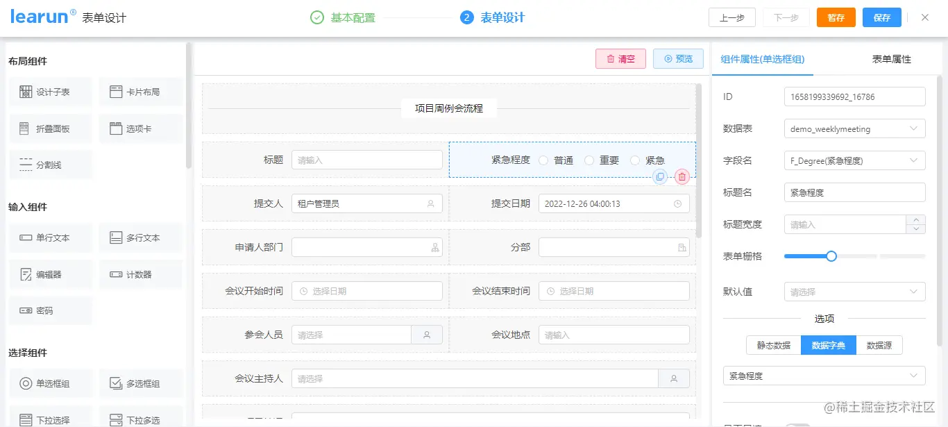 点击右上方的[下一步]进入表单设计界面。在左侧的控件区,LeaRun内置了多种组件供使用,直接拖拽左侧的组件到中间表单界面即可编辑。中间的设计区支持通过拖拽的方式调整控件的顺序和嵌套关系。并可以点击控件即选中控件,实现删除和复制操作以及其他定制化功能。右侧的配置区可以设置表单属性以及组件属性,进行表单尺寸、打开表单方式、选项卡添加设置等操作。
